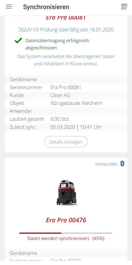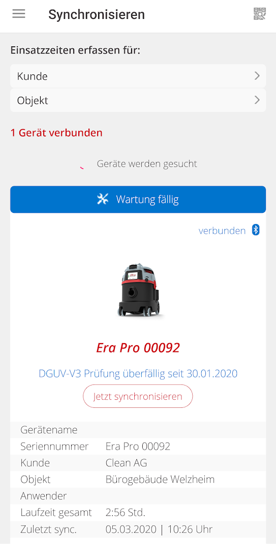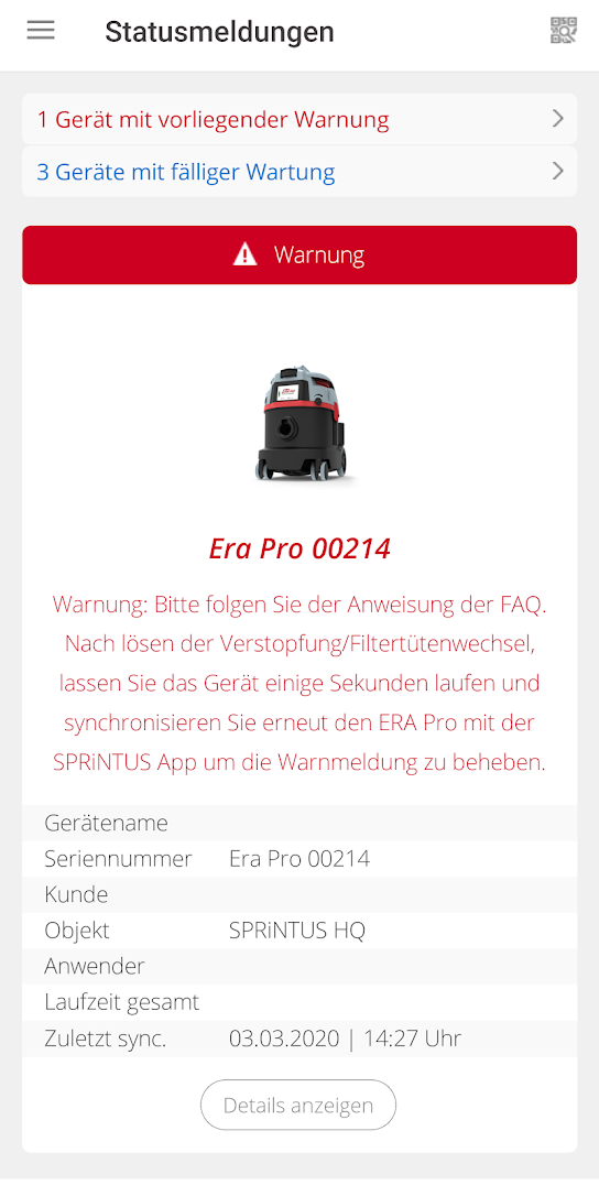 Sie können für jedes digitale Reinigungsgerät von SPRiNTUS Wartungstermine, wie z.B. BGV A3 Prüfung oder Störungen jederzeit abrufen.