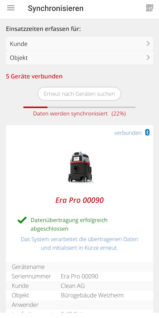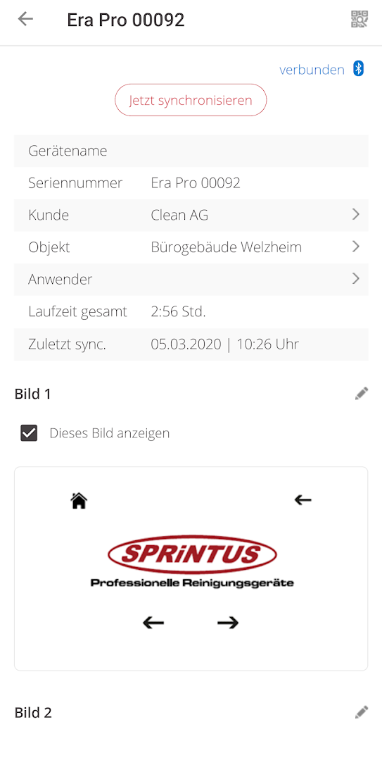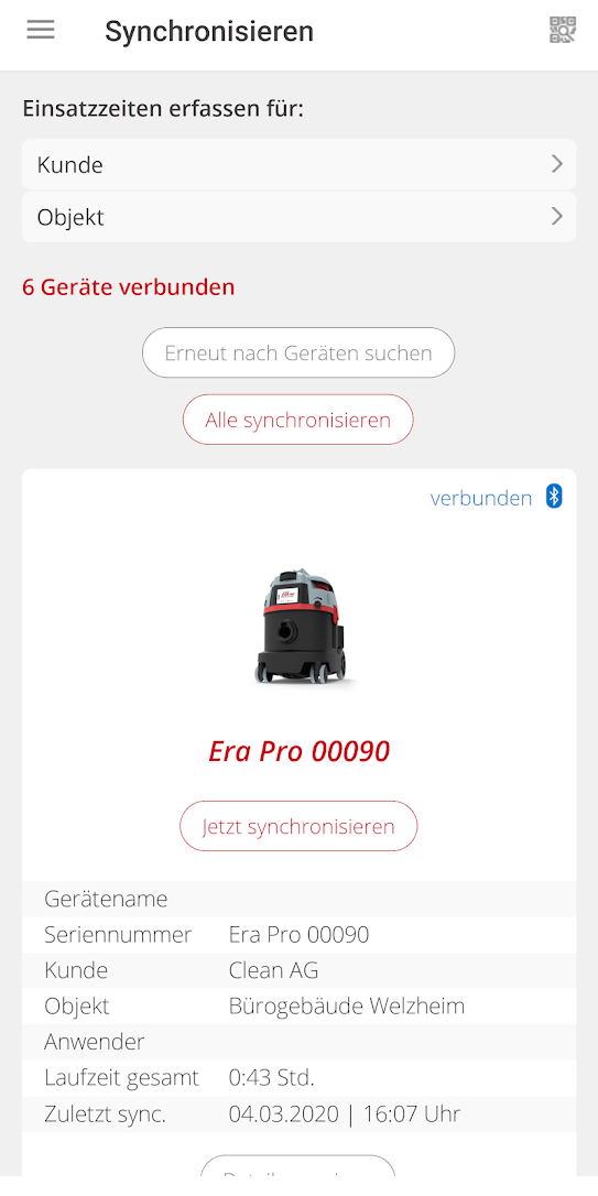 Sie können für jedes digitale Reinigungsgerät von SPRiNTUS relevante Daten, wie zum Beispiel den Standort, Objektnamen, Anwender, Tageslaufzeiten, Wartungstermine, wie z.B. DGUV V3 Prüfung oder Störungen jederzeit abrufen. Mit der Synchronisation über die SPRiNTUS App werden alle Daten in Echtzeit SPRiNTUS Flottenmanagement angezeigt.