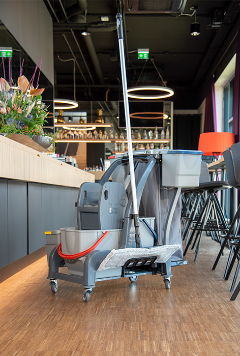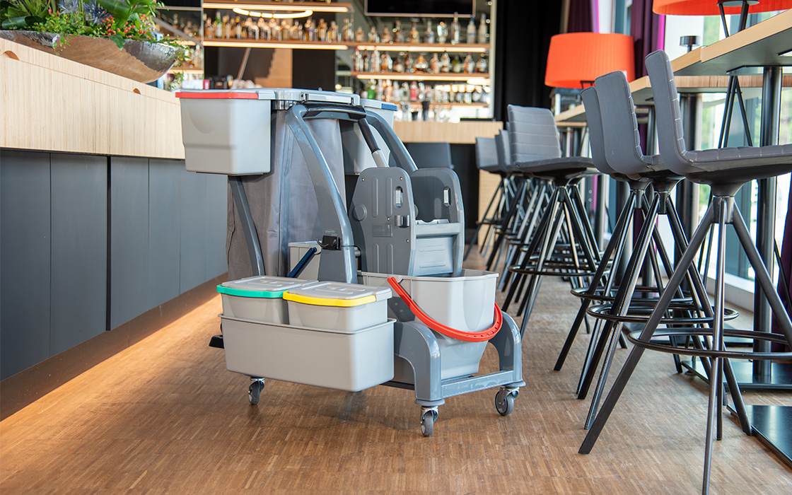 Erweiterbarer Systemwagen in drei Ausführungen. Praxisorientierte Lösungen in Profiqualität mit hochwertiger Verarbeitung, stabiler Mopp-Presse und gummierten Lenkrollen.