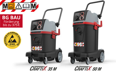 Für eine effiziente Bekämpfung von Stäuben der Staubklassen L, M und H bieten wir Ihnen die CraftiX Modellreihe mit insgesamt sechs Sicherheitssaugern. In beiden Staubklassen haben Sie jeweils die Wahl zwischen einem Modell mit 35 Liter und 50 Liter Behältervolumen.