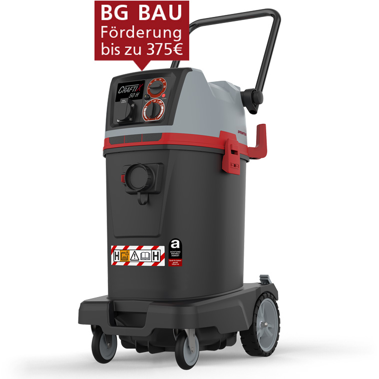 Die Berufsgenossenschaft der Bauwirtschaft unterstützt ihre Mitglieder beim Kauf eines SPRiNTUS Sicherheitssaugers der Staubklasse M & H mit der Übernahme von bis zu 375 Euro bzw. maximal 50 Prozent des Nettorechnungspreises.