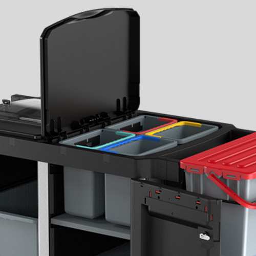 Thanks to smooth, easy‑to‑disinfect surfaces and a 4‑color coding system, the series meets the strictest hygiene requirements. Practical features like foldable lids, generous storage space, and multifunctional holders make daily work efficient and comfortable. Robust swivel castors with thread guards and brakes provide exceptional stability and mobility.