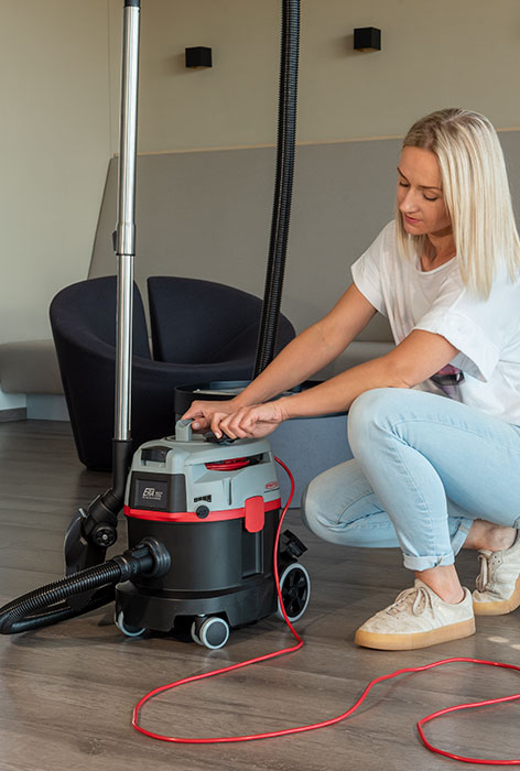 High-performance dry vacuum cleaner with an automated power socket for electric tools.