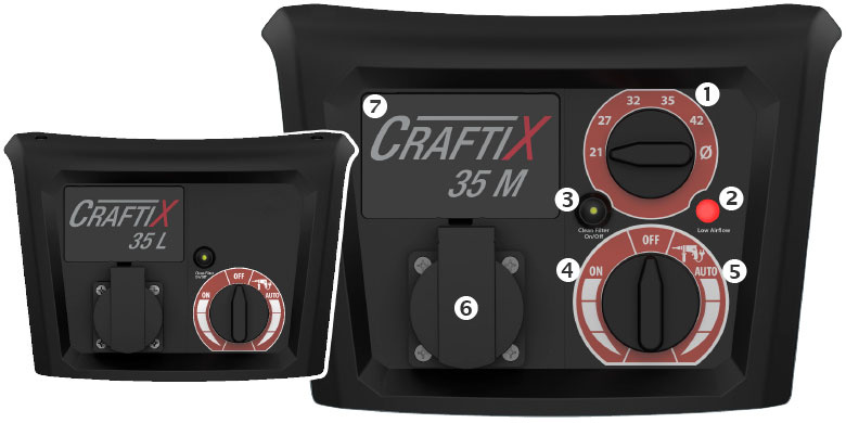 With the two CraftiX models of dust class M, the suction power is monitored by a warning device. After setting the smallest diameter used in the suction harness, the user is warned by an acoustic and visual signal if the required air flow is not reached. This avoids increased dust pollution of breathable air.