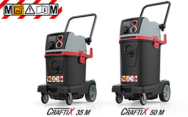 Wood dusts, paint dusts or other dusts – the two safety vacuum cleaners CraftiX 35 M and 50 M absorb hazardous Class-M dusts before they enter breathable air. Due to the standard anti-static equipment, the two M safety vacuum cleaners are ideal for extracting large amounts of fine dust directly on the power tool.