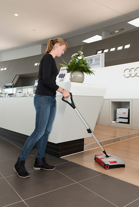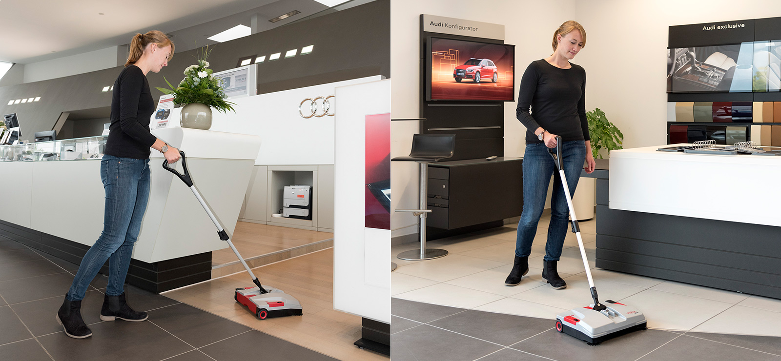 Balai mécanique industriel avec batterie rechargeable pour un nettoyage rapide, silencieux et sans fil de toutes les surfaces, à l’intérieur comme à l’extérieur.