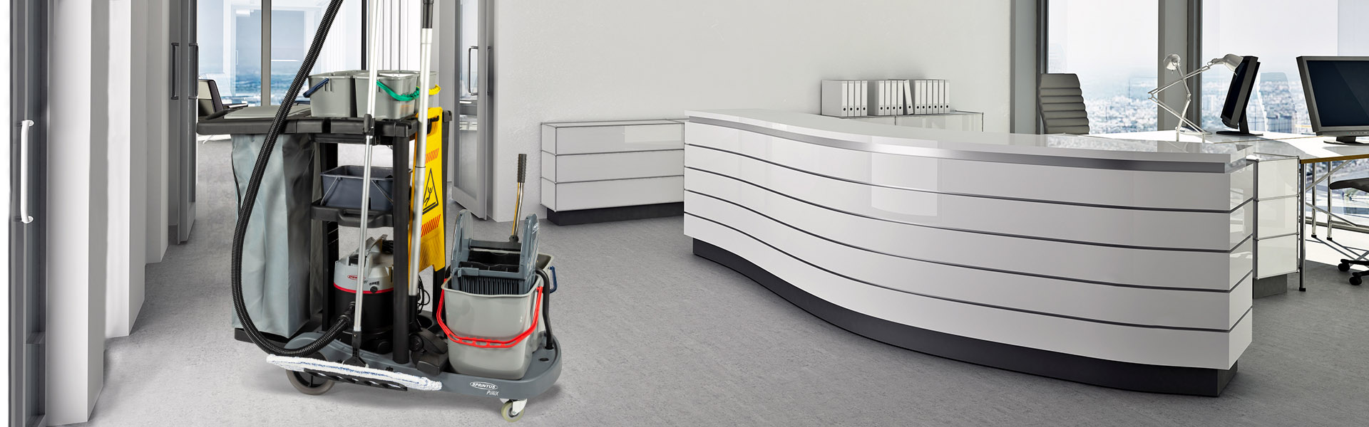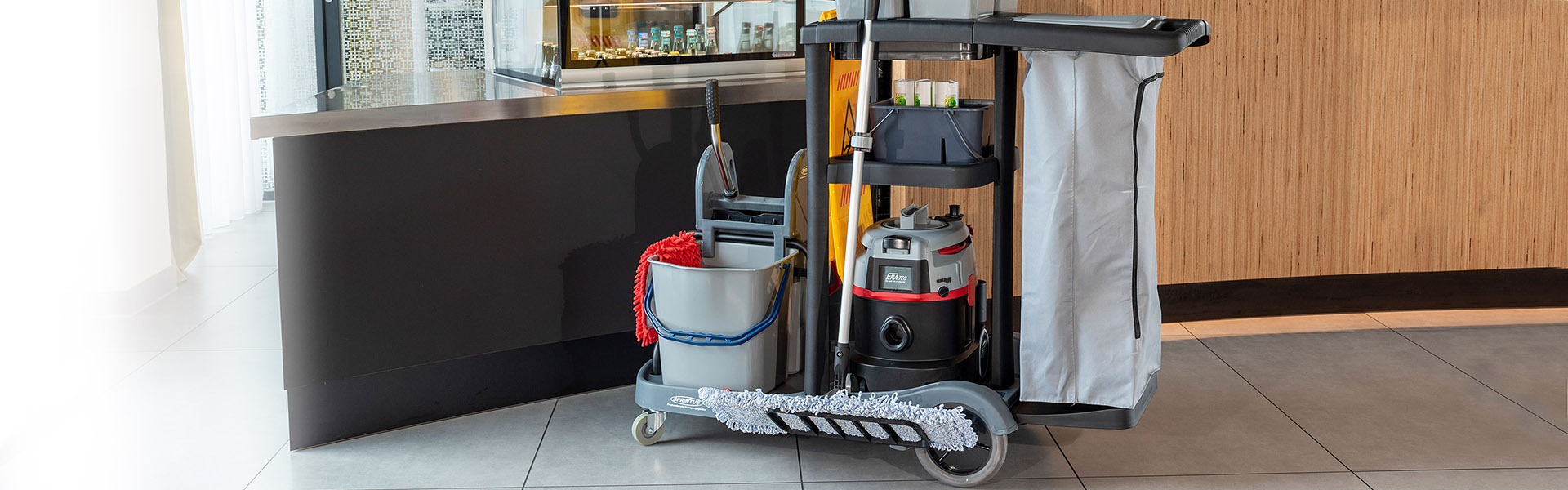 En série, le chariot de service est livré avec quatre seaux, un emplacement latéral pour un balai à franges, un sac à linge/poubelle d'un vaste volume de 120 litres et une presse à rouleau à double barre.