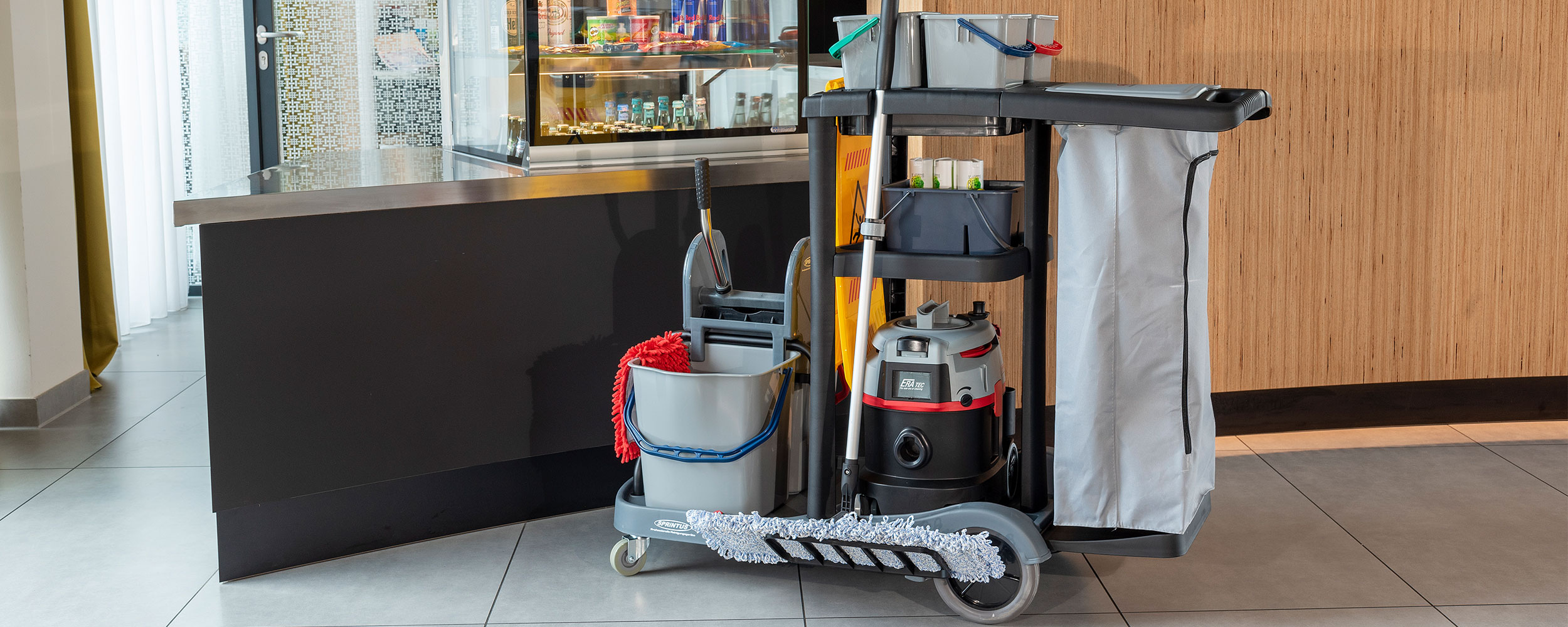 Acest cărucior destinat activităților de curățenie profesională, este compus din 2 panouri din plastic foarte rezistent, un panou de bază și unul în spatele căruciorului. Acesta din urmă poate fi îndepărtat, în funcție de necesități. Stabilitatea deosebită este asigurată de roțile metalice pivotante, în față, și cele mari din spate, toate îmbrăcate în cauciuc. În spate este echipat cu un capac pentru coșul de colectare gunoi sau lenjerie murdară. Mopul sau mătura pot fi fixate pe partea laterală. Pe cadrul căruciorului este montat și un cârlig de prindere a unui indicator “Atenție podea umedă“ . În dotarea standard căruciorul multifuncțional este echipat cu 4 găleți, un suport lateral pentru mop, sac de 120 litri pentru lenjerie murdară sau gunoi și un storcător de mop. De asemenea pe cărucior poate fi montată și o măturătoare MEDUSA.